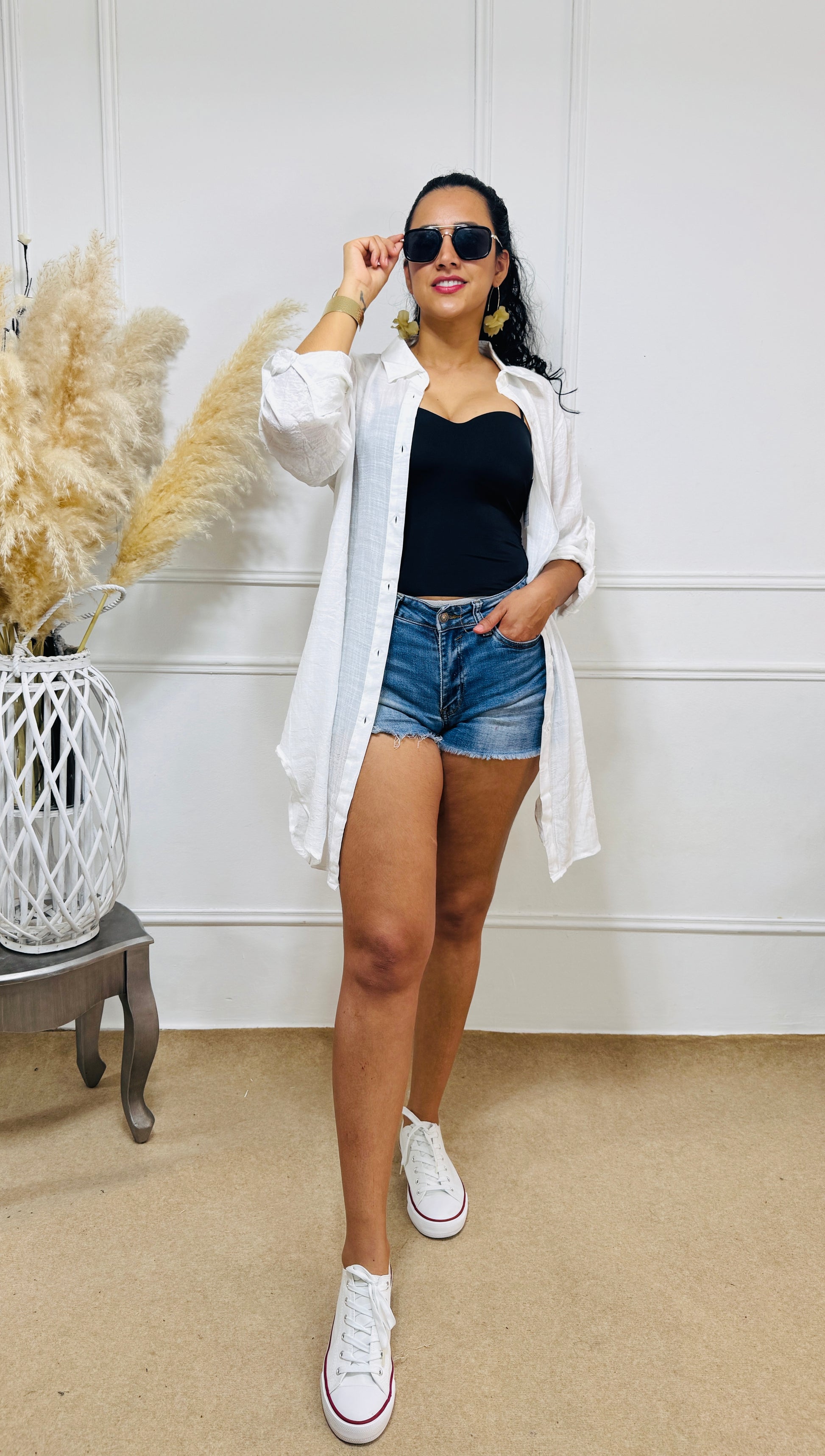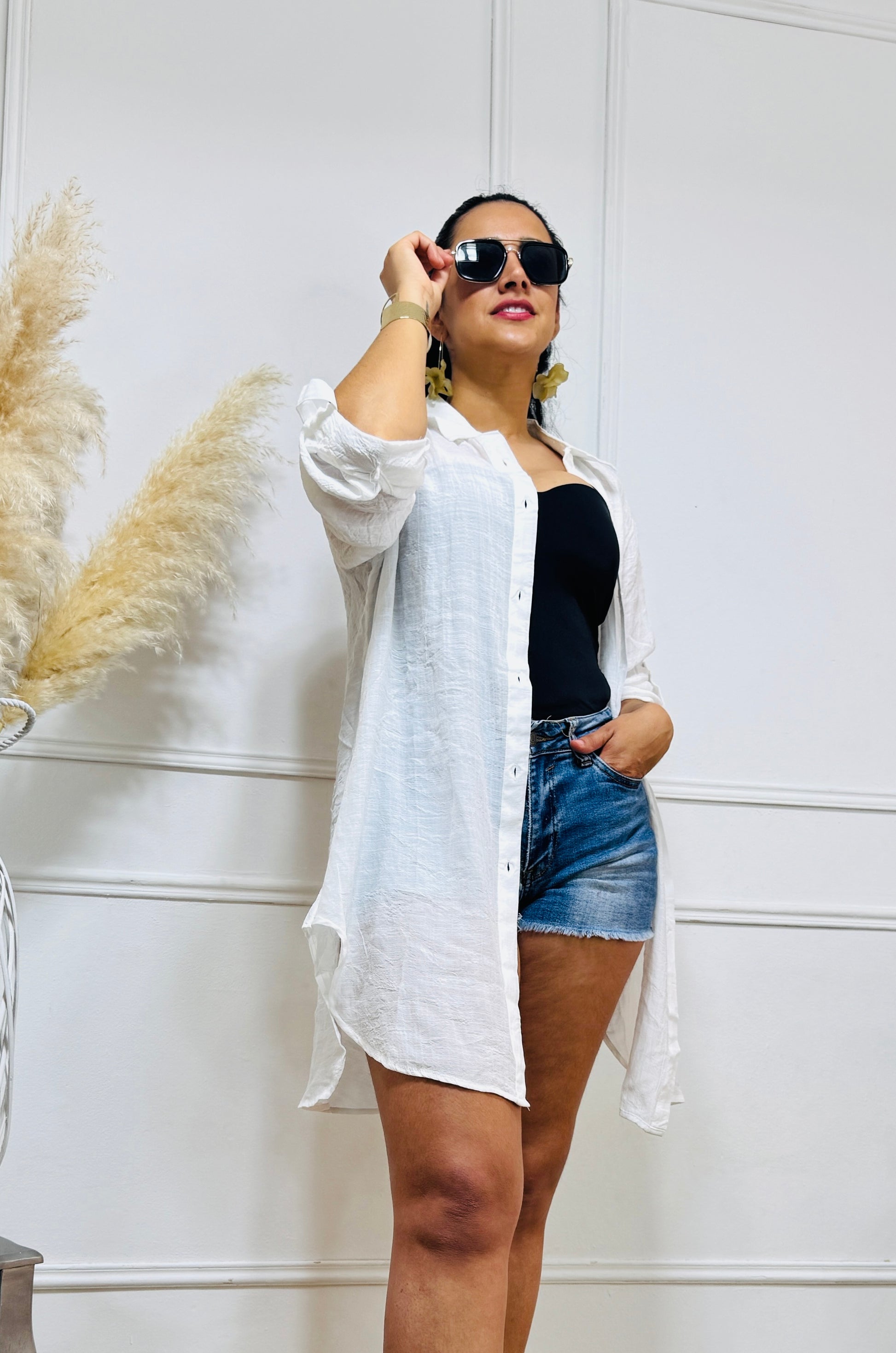 Blusa camisera larga y suelta, confeccionada en un tejido tipo lino ligero y transpirable, perfecta para disfrutar de los días soleados con comodidad y estilo. Su diseño amplio y relajado aporta frescura, mientras que el corte camisero le da un toque atemporal y versátil.