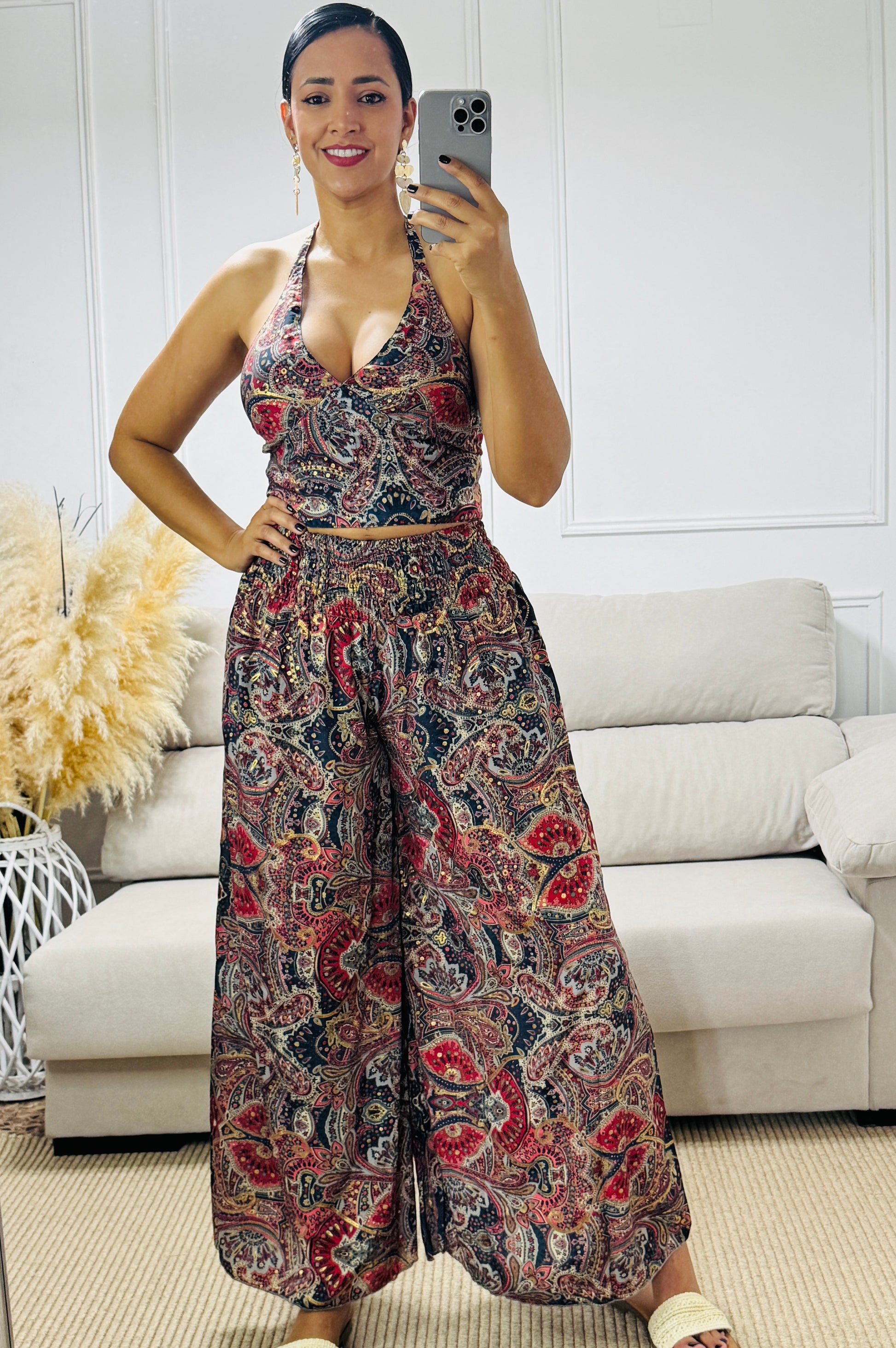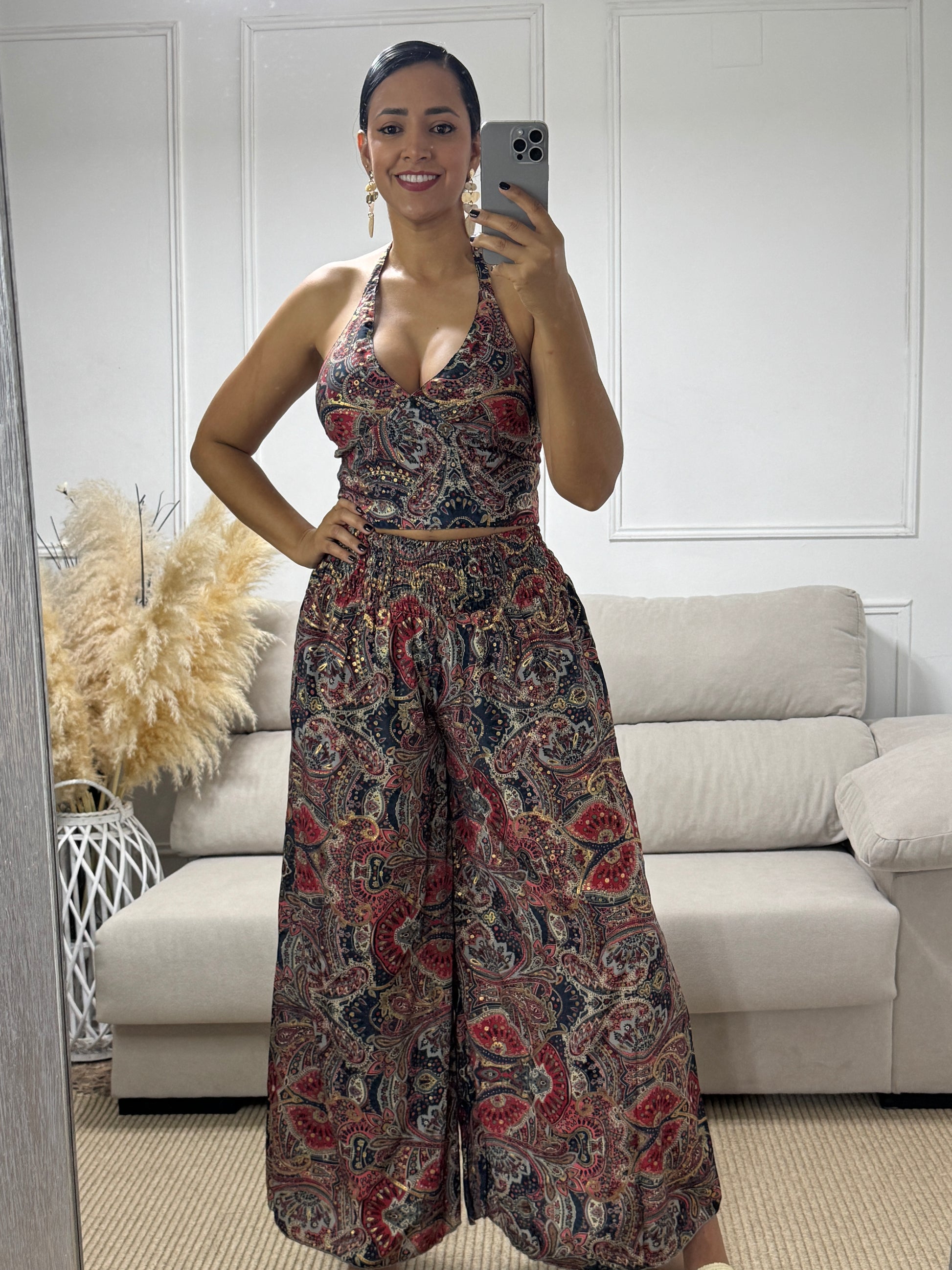 El top escotado con amarre en la espalda resalta la silueta con un toque sensual y femenino, mientras que el estampado de arabescos añade un aire sofisticado, artístico y lleno de personalidad.