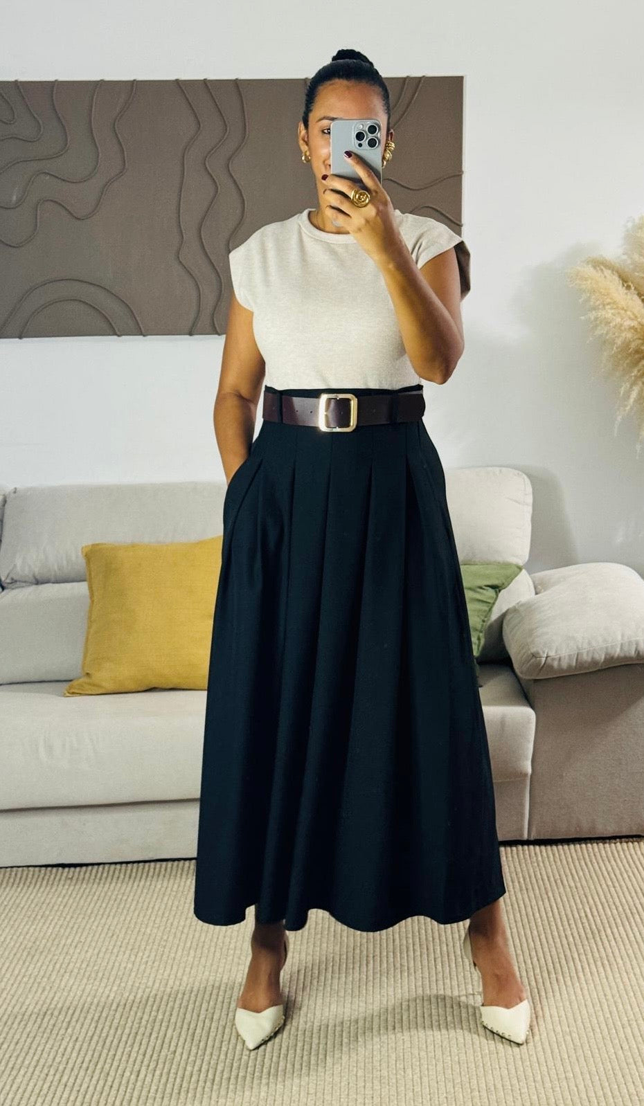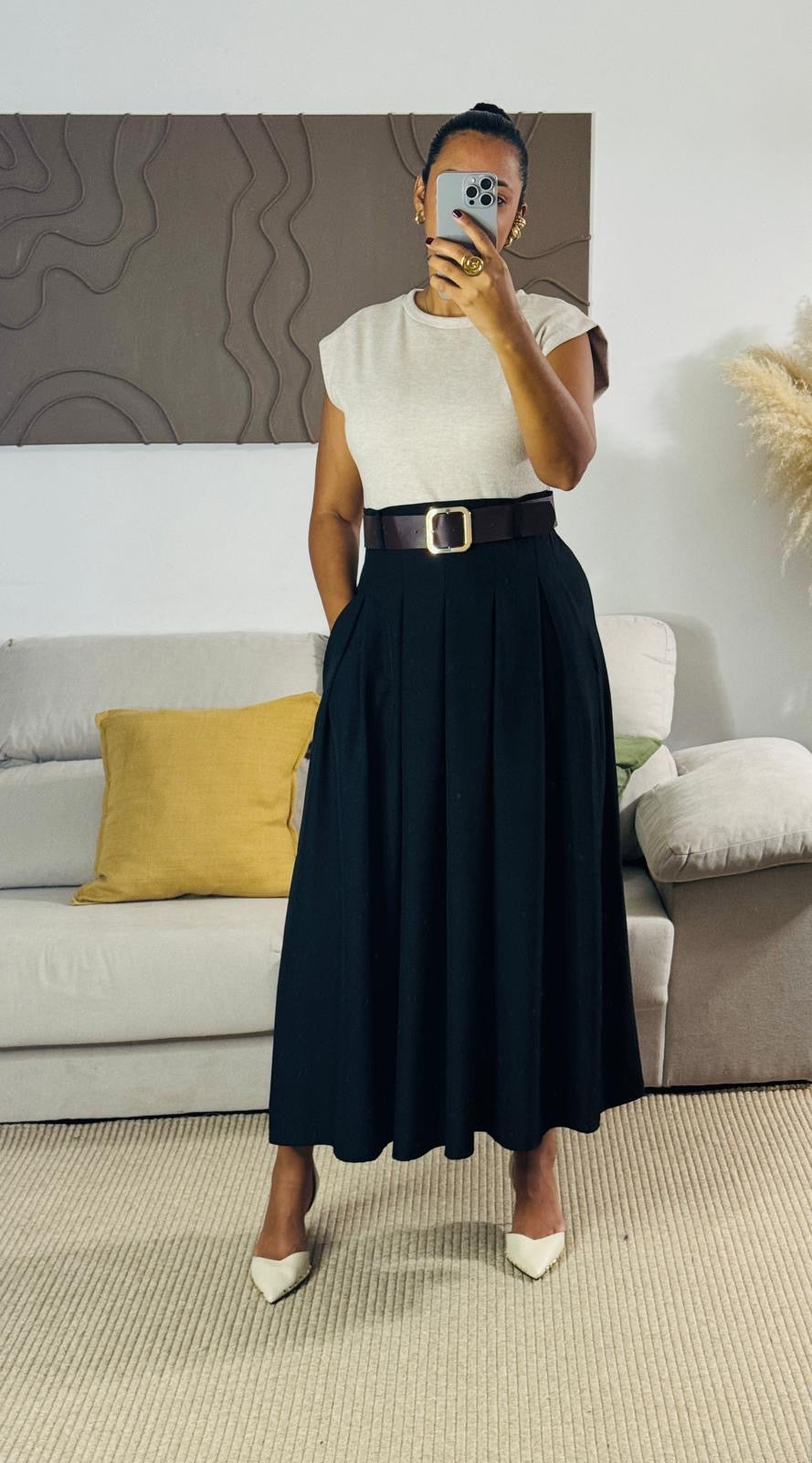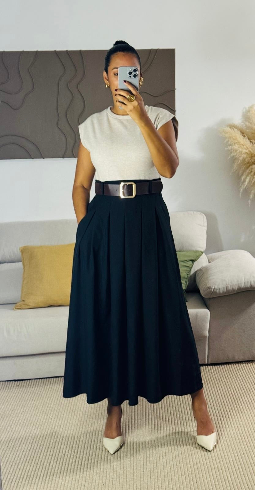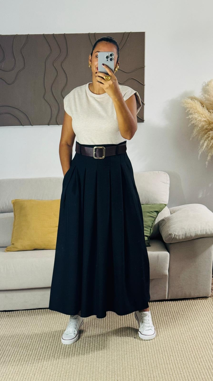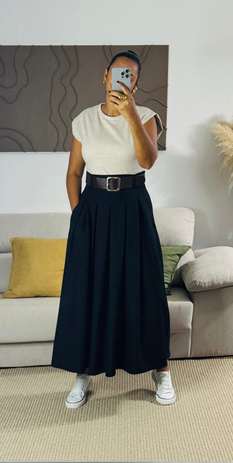 Falda negra larga con prenses que aportan movimiento y elegancia a cada paso. Su diseño clásico y versátil permite combinarla tanto con blusas formales como con tops casuales, creando looks sofisticados para cualquier ocasión. Confeccionada en tela ligera y de caída fluida, es una pieza imprescindible en el guardarropa femenino.