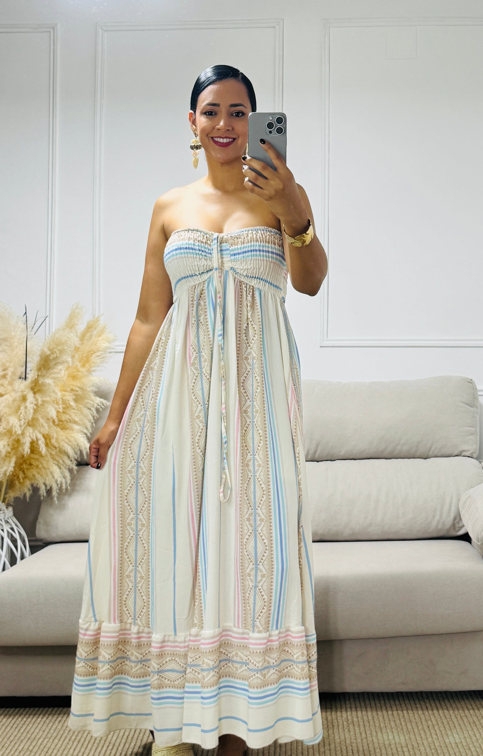 Este vestido strapless resalta tus hombros con elegancia y se ajusta suavemente en la parte superior para mayor comodidad.