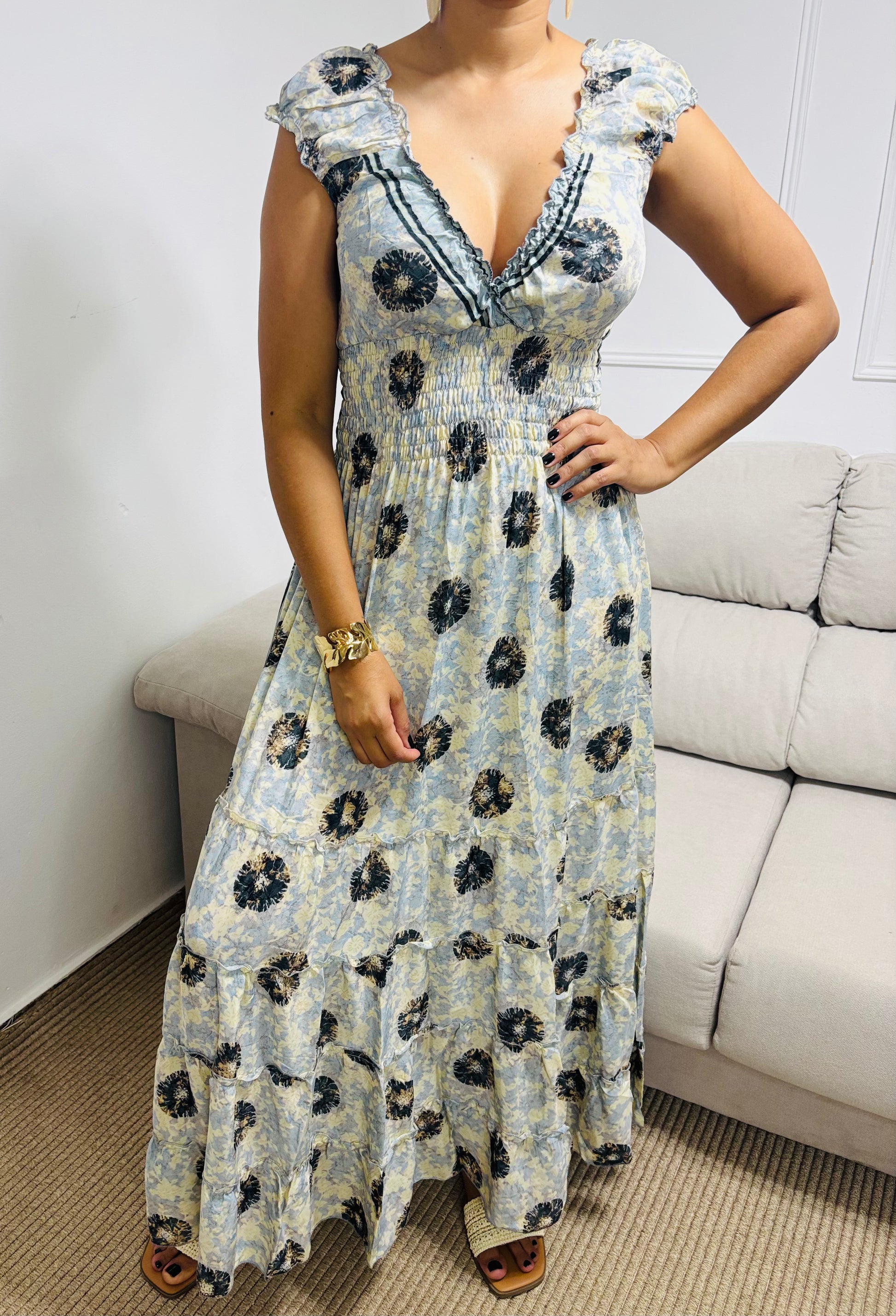 El escote suave y favorecedor realza el busto con delicadeza, mientras que su corte suelto desde la cintura hacia abajo ofrece libertad de movimiento y una silueta ligera, perfecta para climas cálidos o eventos al aire libre.