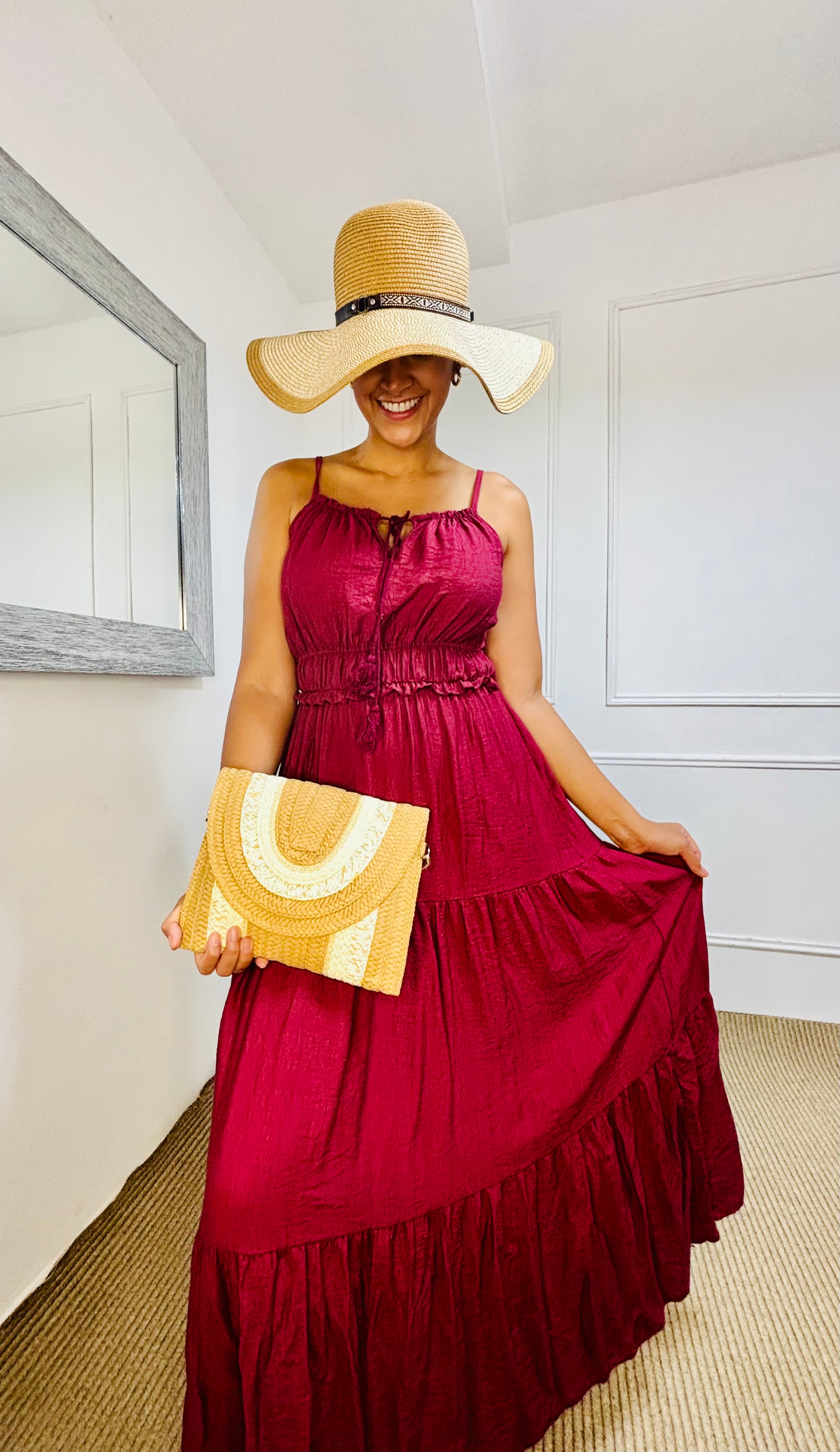 Este vestido largo en tono vino tinto es puro encanto y estilo. Con tiras finas que realzan los hombros y delicados pliegues con pequeños prensados, ofrece un movimiento fluido y una silueta femenina y favorecedora. Ideal para ocasiones especiales, cenas o eventos al atardecer, su diseño mezcla elegancia y comodidad con un toque moderno. ¡Un look que no pasa desapercibido!
