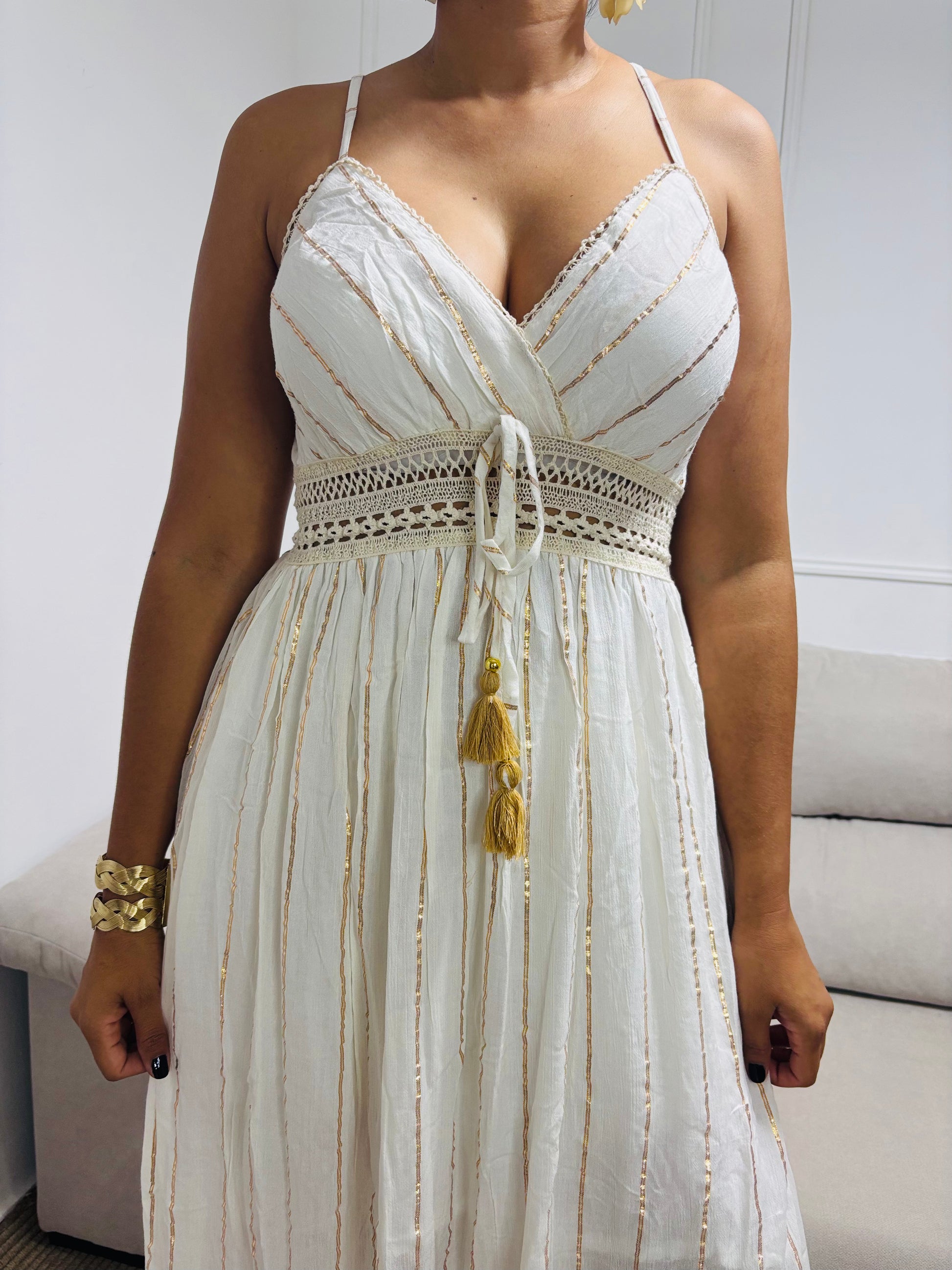 Este vestido de tiras delgadas y escote favorecedor destaca por su estilo relajado y elegante.